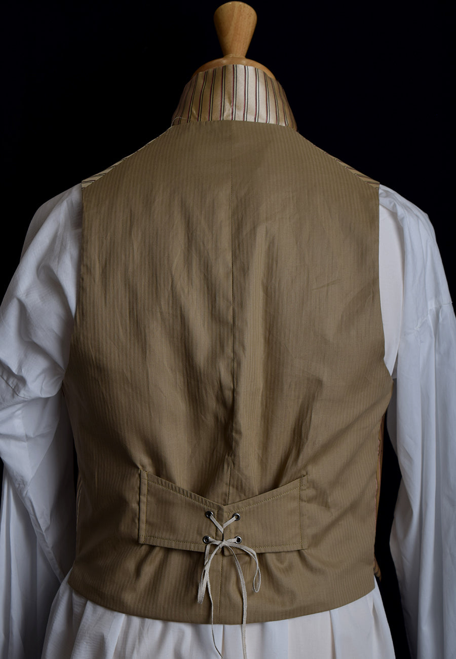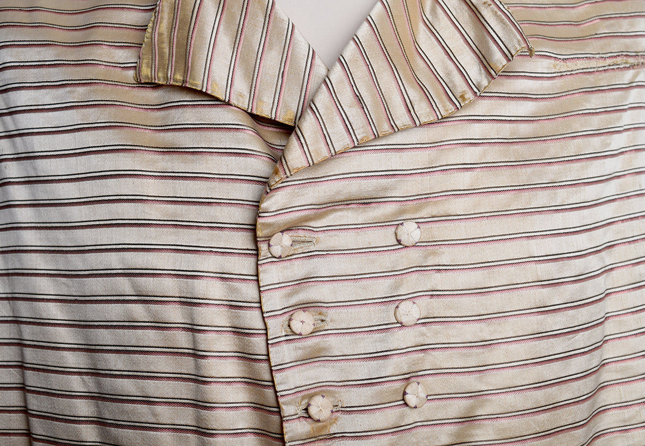 The original waistcoat had horizontal stripes. We made ours vertical because our modern silk was very narrow in width. Either way is equally authentic for the upper classes of the period.